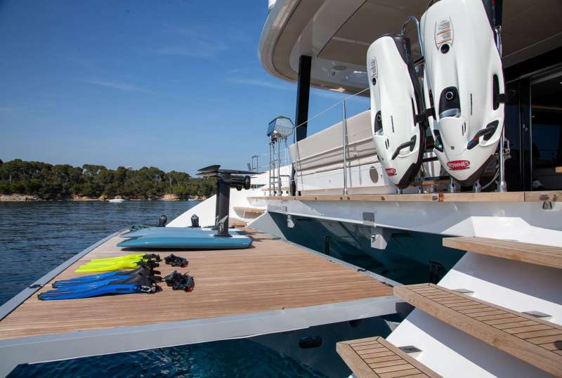 Water Toys: Seabobs, SUPs, kayaks, wakeboards. Larger catamarans: jet skis, efoils, and water slides.