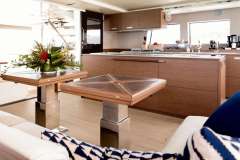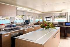 The social heart of the yacht is the stunning open galley, turning every meal into a gourmet theater where your chef prepares fresh delicacies in full view. This connects seamlessly to the salon, finished in a soothing color palette with panoramic windows that flood the space with natural light.