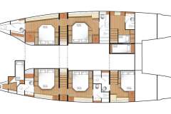Full Moon is classified primarily as a sailing catamaran. The the heart of the yacht is the main saloon, which connects to the aft deck. The aft deck is where heart of the yacht is and that's where most of the delicious meals are served. The tasteful cabins offer unbeatable views in the morning and are located just below deck. The cabins offer designer mattrace beds and feature ensuite bathrooms. Multiple portholes add to the feeling of connection with the discovered environment.