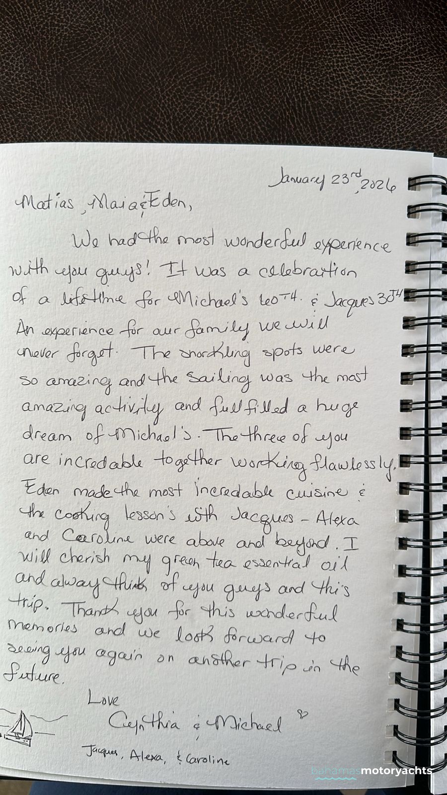 Maia, your music was an absolute joy to listen to that filled our hearts with such pleasure. Don' t ever stop singing and playing the piano and guitar. Matias you made us always feel safe knowing you were in complete control of the boat. Eden, your quiet kindness was a joy to see and and really enjoyed everything you cooked for us. Until we meet again, thank you!!