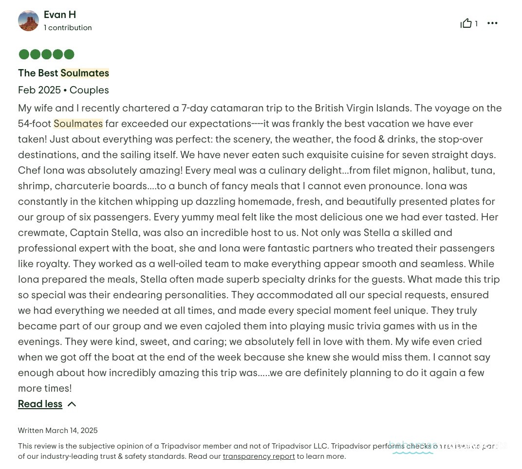 7. Any tandem charter involving multiple yachts requires the guests that paid for a specific yacht and are on that yachts manifest to be the only guests on that yacht during meal services, while underway, and overnight sleeping. This is due to safety and maritime requirements. Pickups outside of the BVI have a relocation fee.