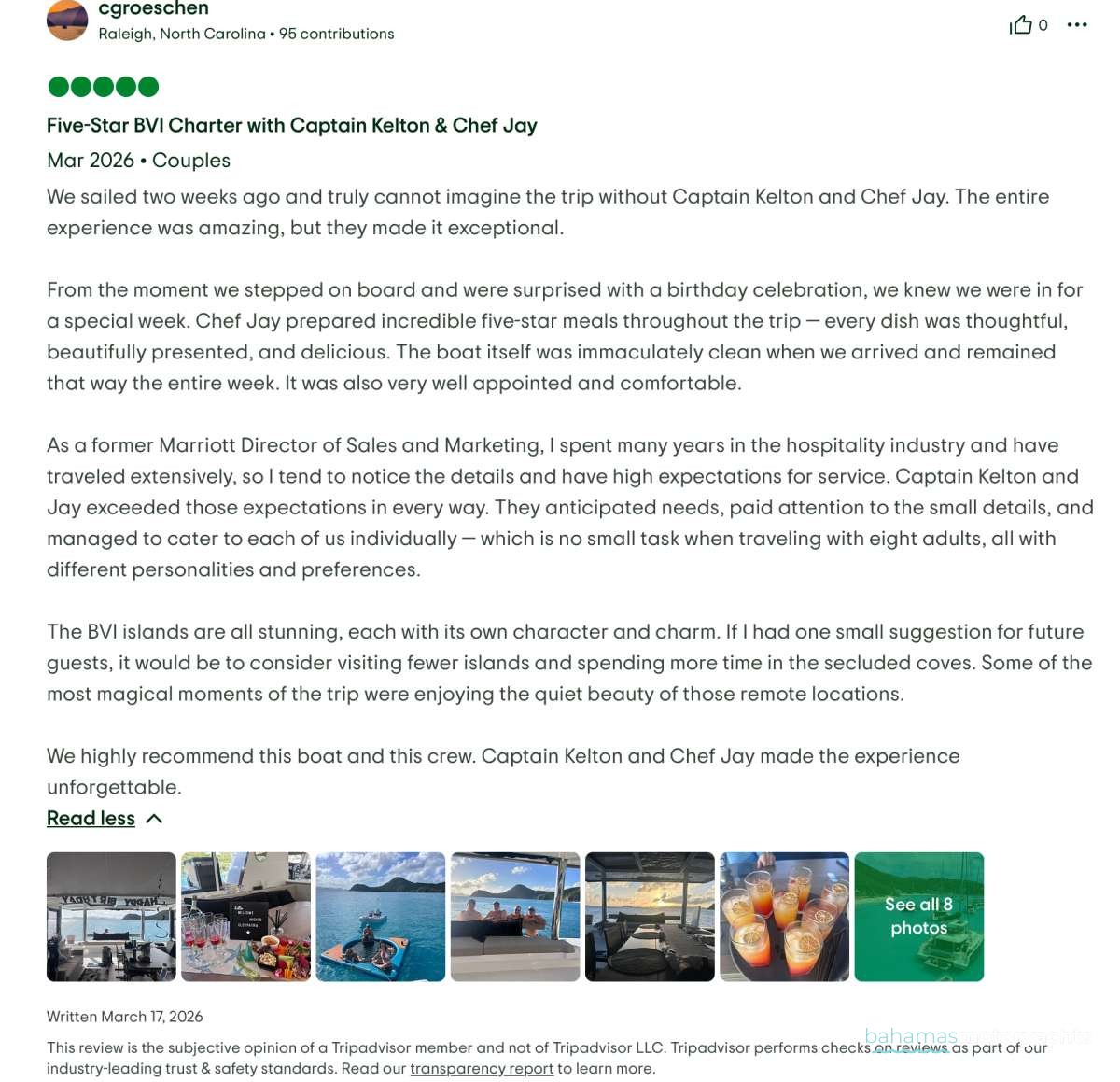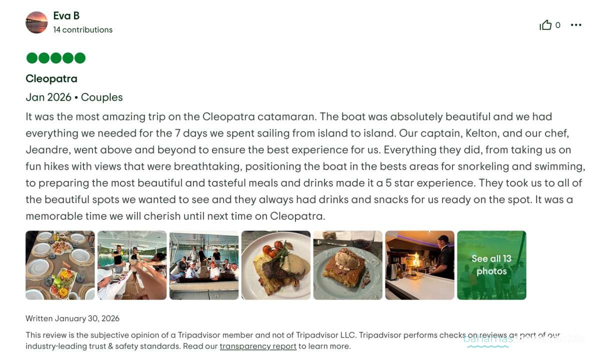 Kelton would suggest a route for the day with places to swim & snorkel, a walk on land, a stop for lunch/dinner and even shop! Jay would check in with the menu and was attentive to food allergies & dislikes! The catamaran was always clean, the food amazing - the guys both worked so hard and were always smiling!
