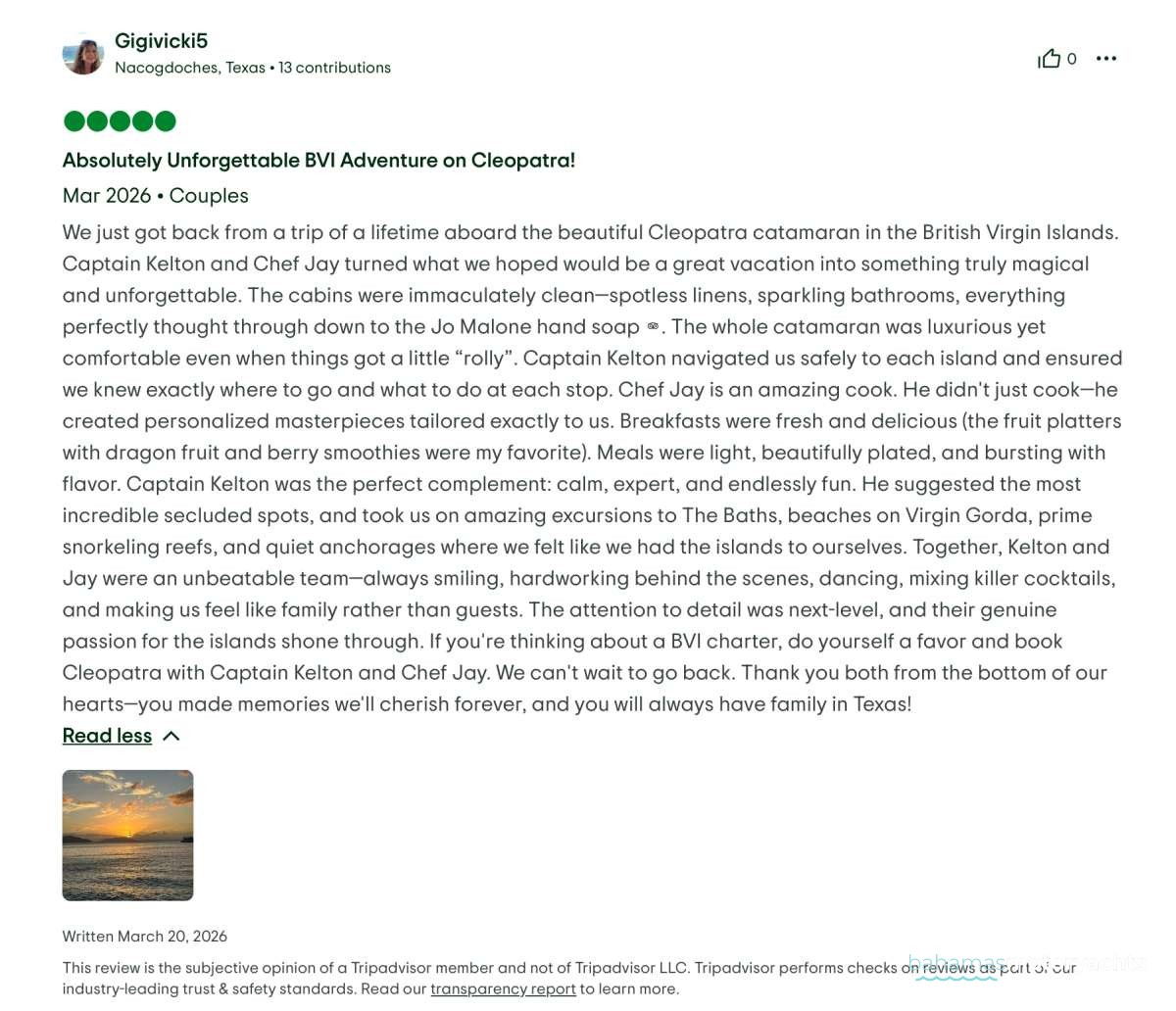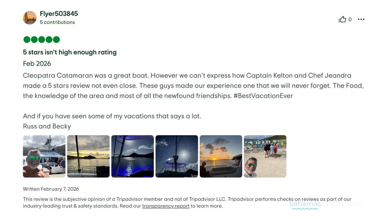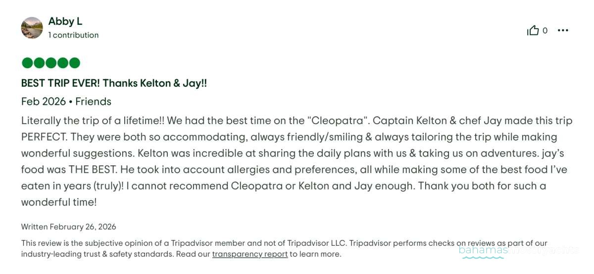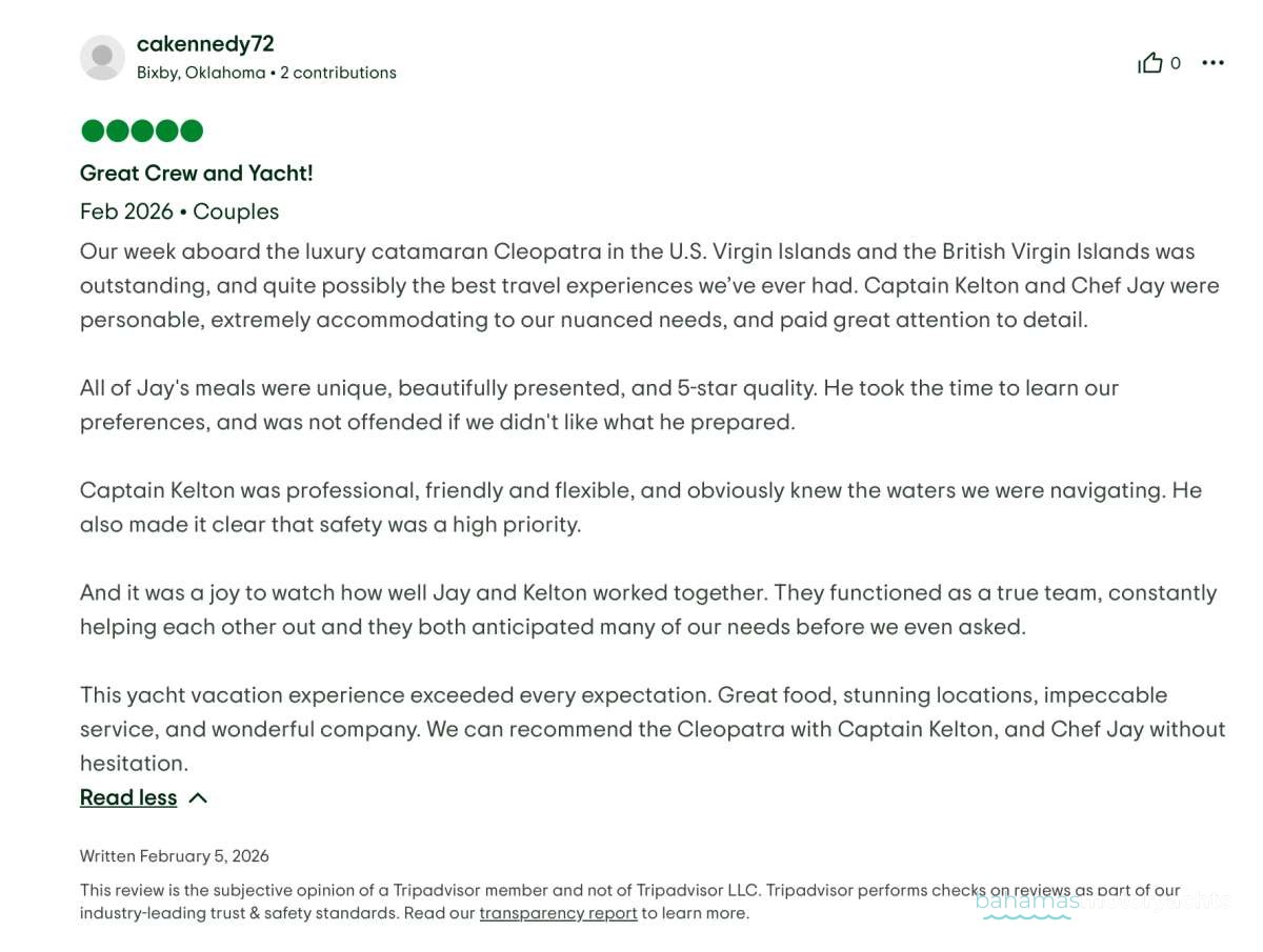 This yacht vacation experience exceeded every expectation. Great food, stunning locations, impeccable service, and wonderful company. We can recommend the Cleopatra with Captain Kelton, and Chef Jay without hesitation.