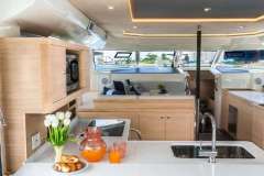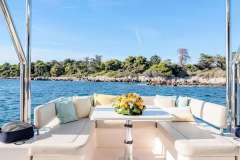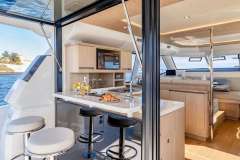 Aft Deck with table for 6, Bar with Stools, Microwave, Cook Top, Refrigerator, Freezer, Dishwasher.