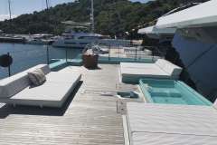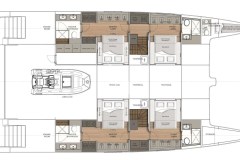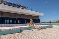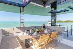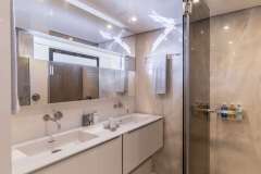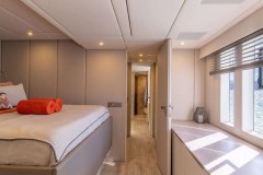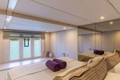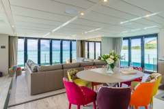 She accommodates 8 guests in 2 Master Cabins and 2 double cabins. The yacht’s interior decor is neutral in tone and has an elegant atmosphere. Her salon has an open floor plan with a comfortable lounge and formal dining. The space is surrounded by windows, which provide plenty of natural light.