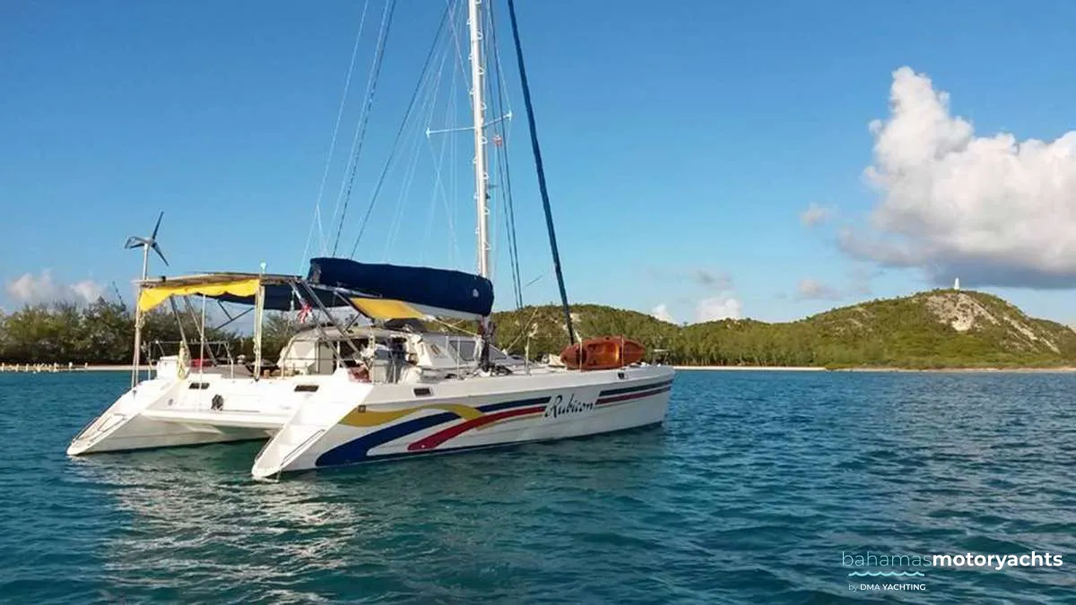 Offered by DMA Yachting, the breathtaking charter yacht RUBICON is a 44 ft sailing catamaran. The most appealing features of RUBICON are her well-chosen interiors and inviting socializing areas. RUBICON spends the summer and winter season in the Bahamas. She was delivered by the famous yacht builder St. Francis in 1997. A succesful refit was completed in 2013 and Nov. 2015 when her sides, deck and cockpit sprayed with Awlgrip. partial refit January 2020 to include new hard floors throughout.. The spacious yacht layout features 3 cozy cabins and comfortably accommodates a maximum of 5 guests.