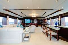 Located aft of the pilothouse featuring a large wet bar with seating for 4, designer Mahogany wall treatment, desk, large settee, fireplace with TV above mantle. Day head located forward.
