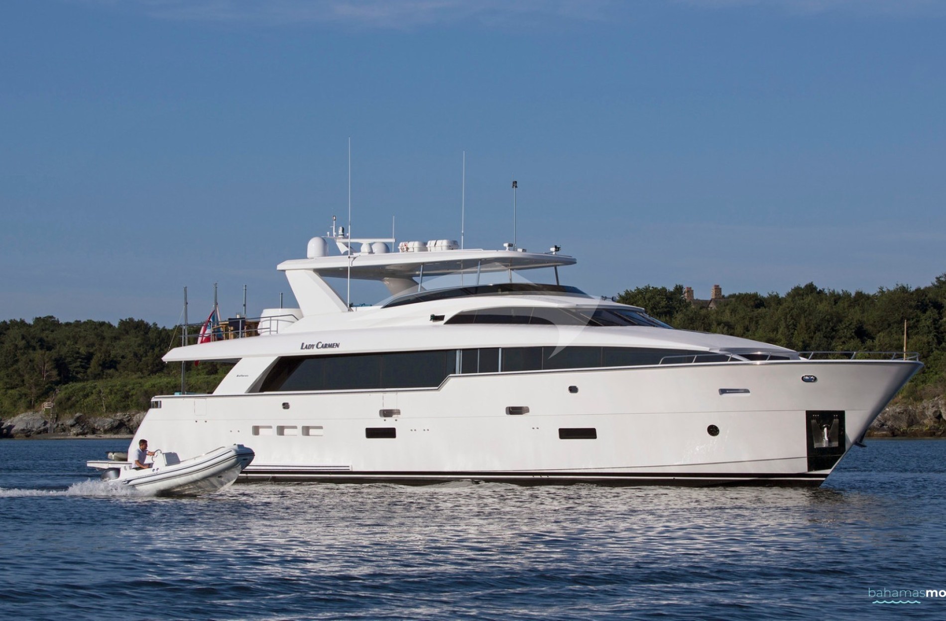 Advertised by DMA Yachting, the impressive charter yacht LADY CARMEN is a 102 ft motor yacht featuring a jetski and a hot tub. The main attractions of LADY CARMEN are her absolute comfort and experienced crew. LADY CARMEN spends the season in the Bahamas. She was delivered by recognized shipbuilder Hatteras in 2016. The ingenious yacht layout features 4 large cabins and easily accommodates up to 8 guests.