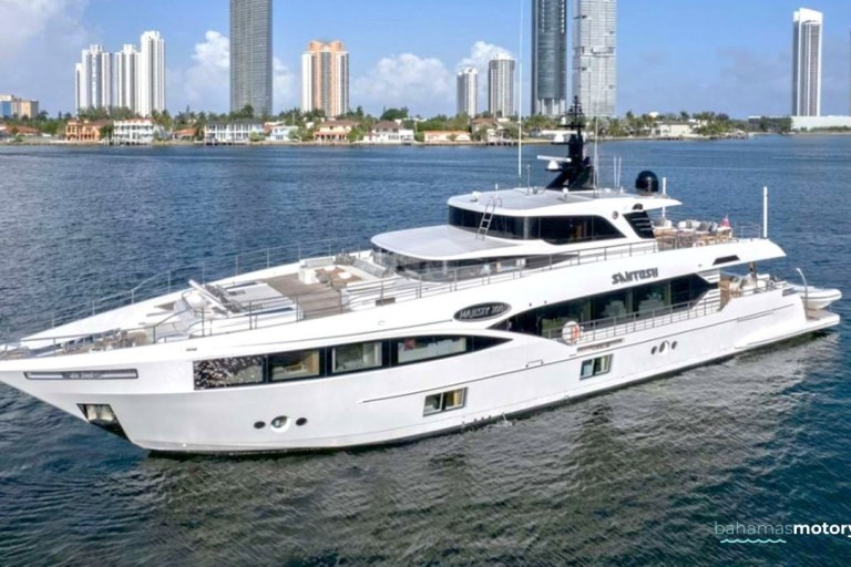 Advertised by DMA Yachting, the majestic charter yacht SANTOSH is a 108 ft motor yacht featuring a jetski and a hot tub. The highlights of SANTOSH are her impeccable styling and experienced crew. SANTOSH spends the season in the Bahamas. She was completed by the well-known ship builder Gulf Craft in 2020. An elegant refit was fulfilled in 2022. The well-planned yacht layout features 5 large cabins and comfortably accommodates a maximum of 12 guests.